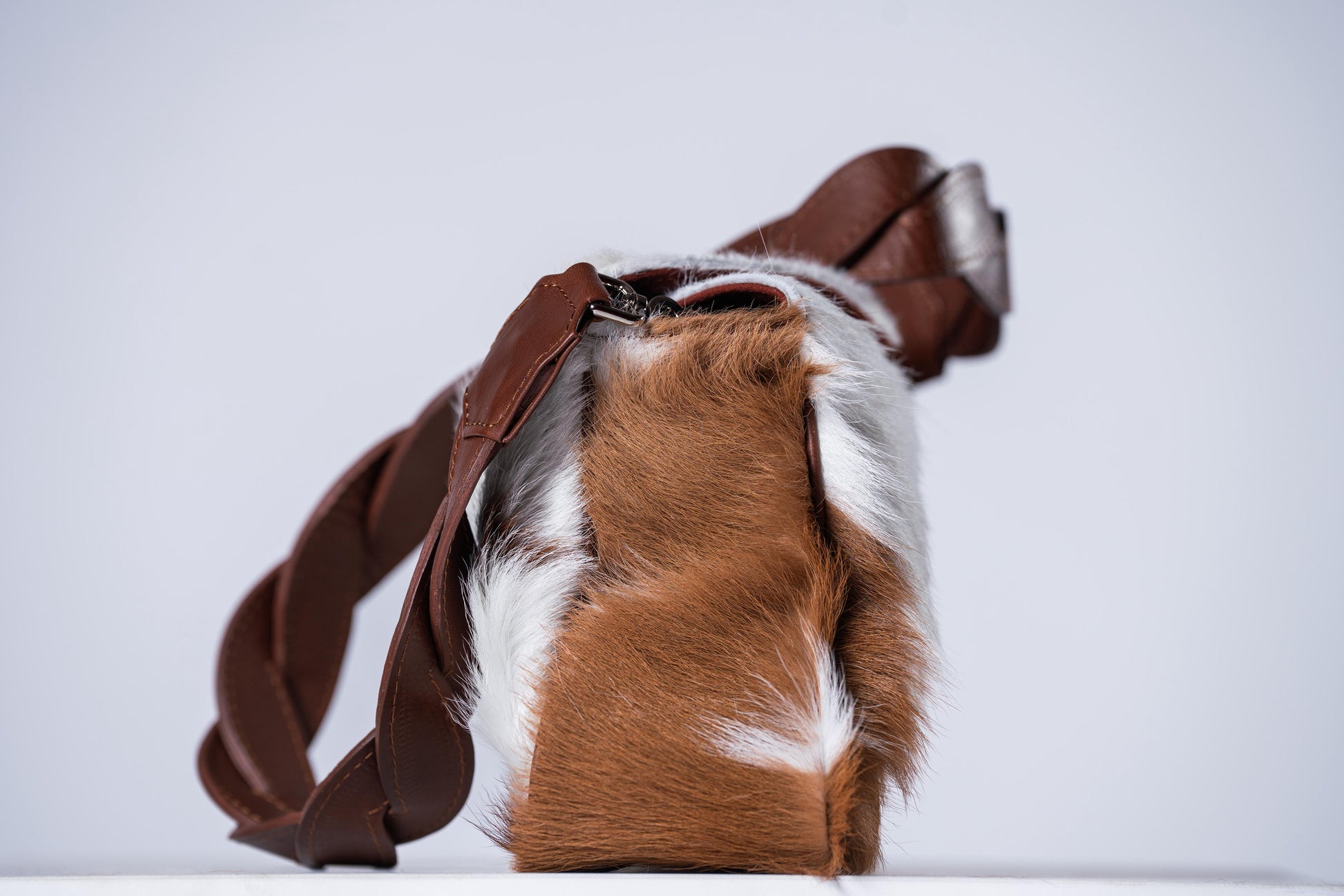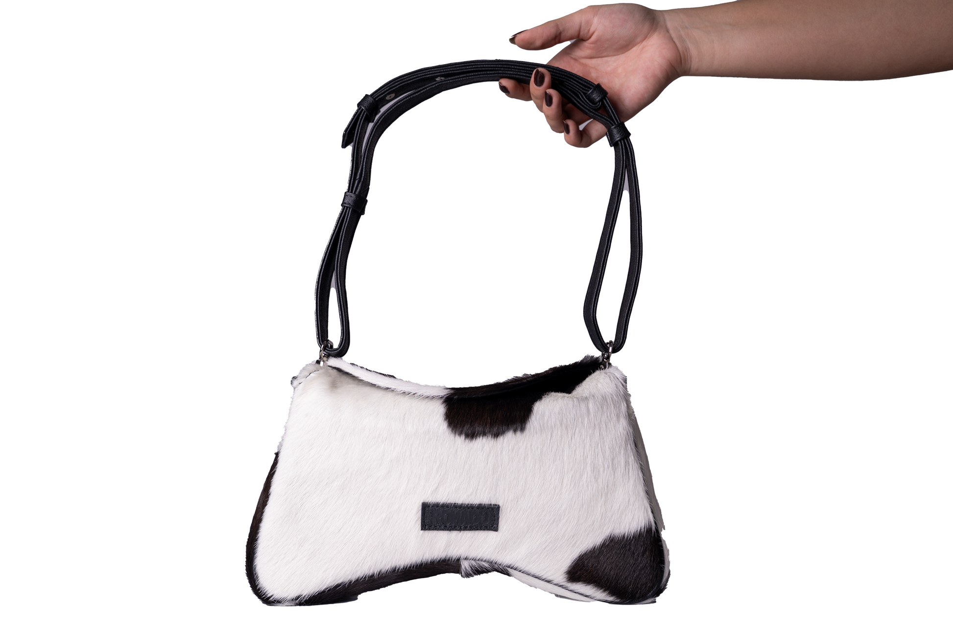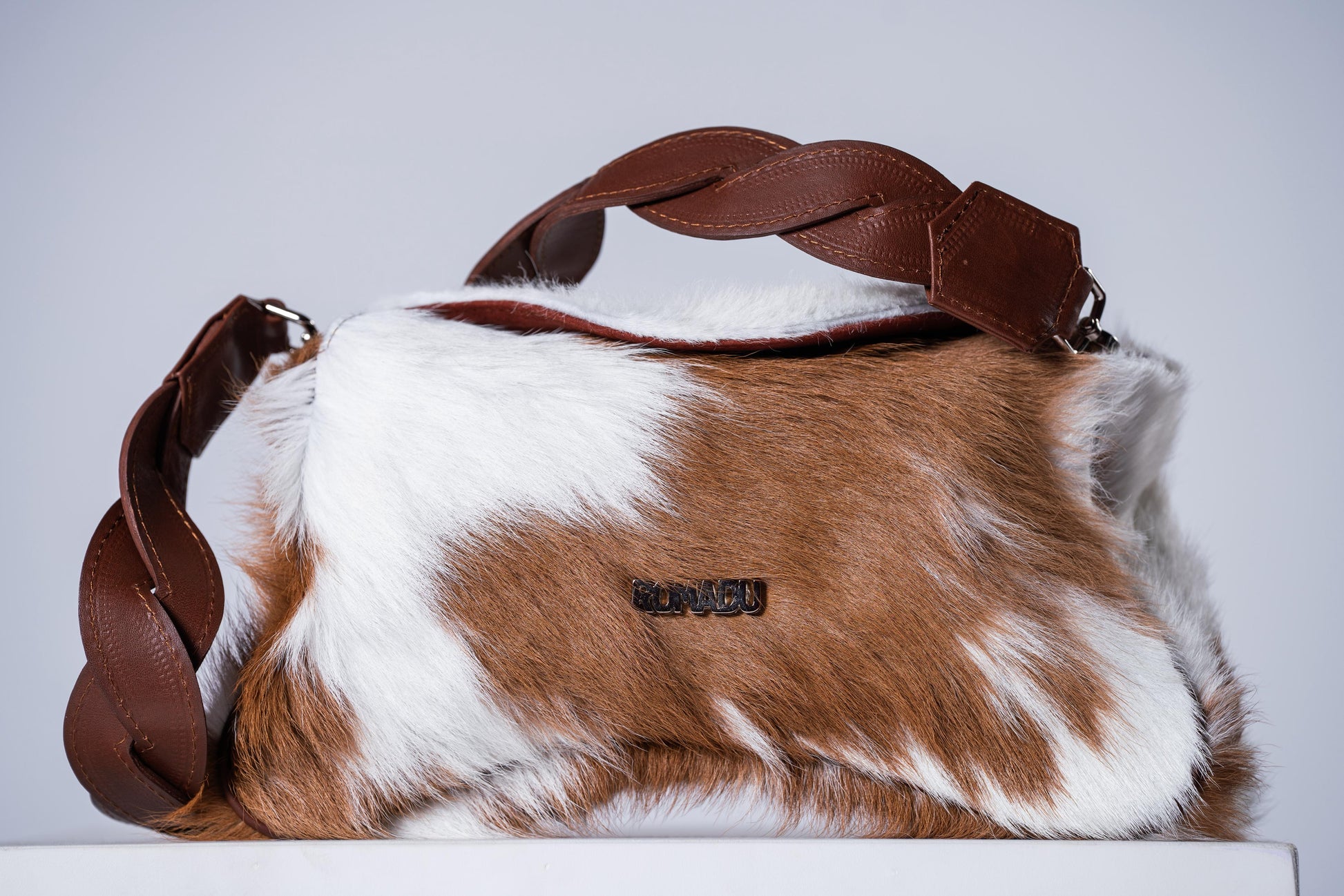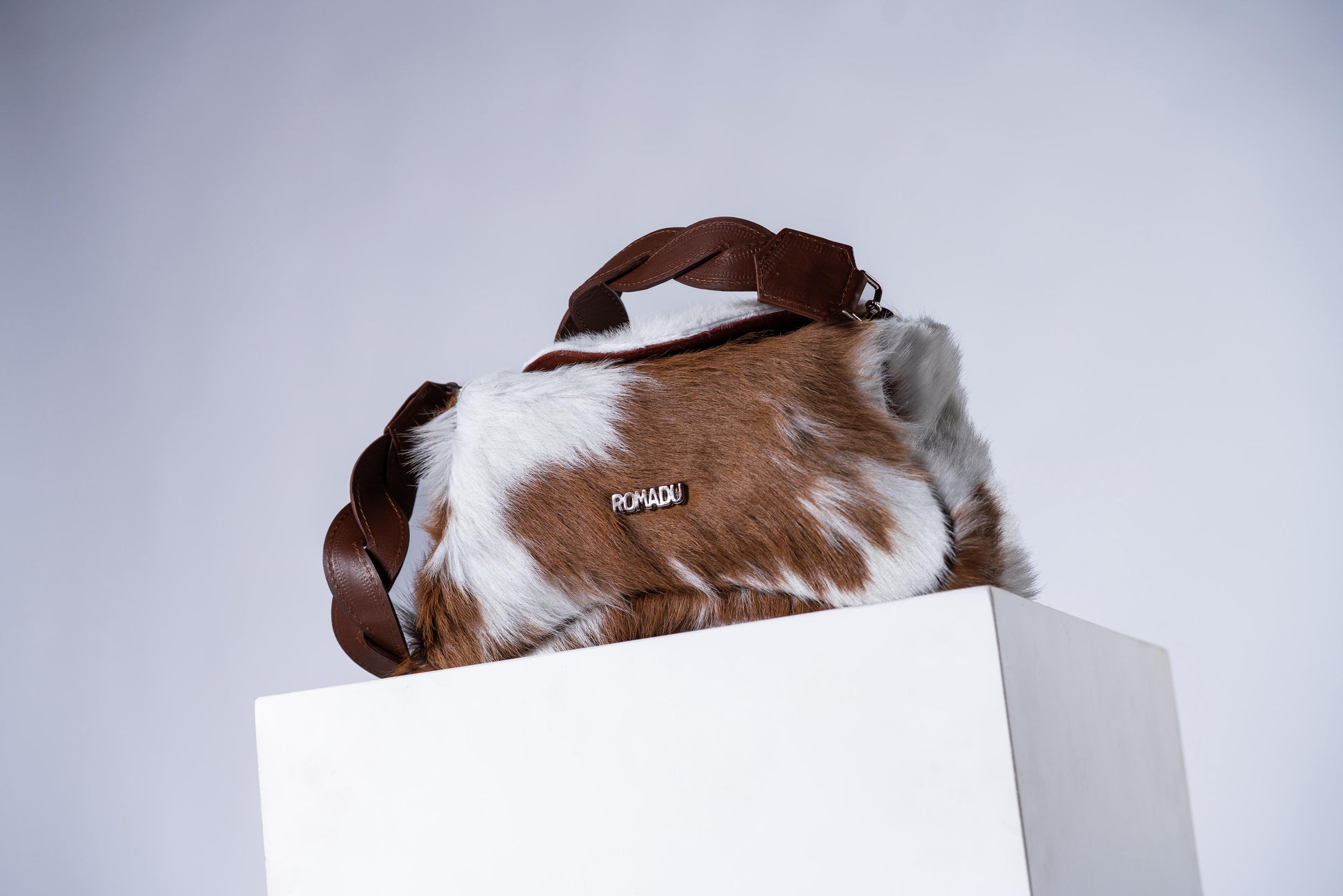 Bolsa con figura de la esencia de ROMADU, geométrica, cuenta con una tapa con imán para cerrar la bolsa, herrajes de metal con acabo en níquel, bolsa versátil, cuenta con 2 strap 1 trenzado y otro liso el cual puedes ajustar al tamaño que tu quieras, cuenta con bolsas dentro de ella para guardar tus cosas, elaborada en 100% cuero vacuno, con un interior de forro textil.